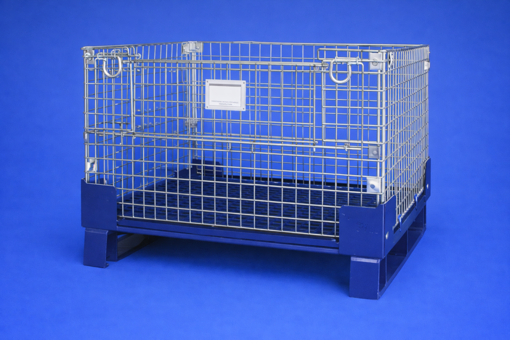 The Collapsible Wire Mesh Pallet is a foldable steel storage container designed for efficient handling, storage and returnable packaging of industrial materials. Its mesh side walls provide visibility and ventilation, while the collapsible structure allows the unit to be folded when empty, saving valuable warehouse space and reducing transportation cost.